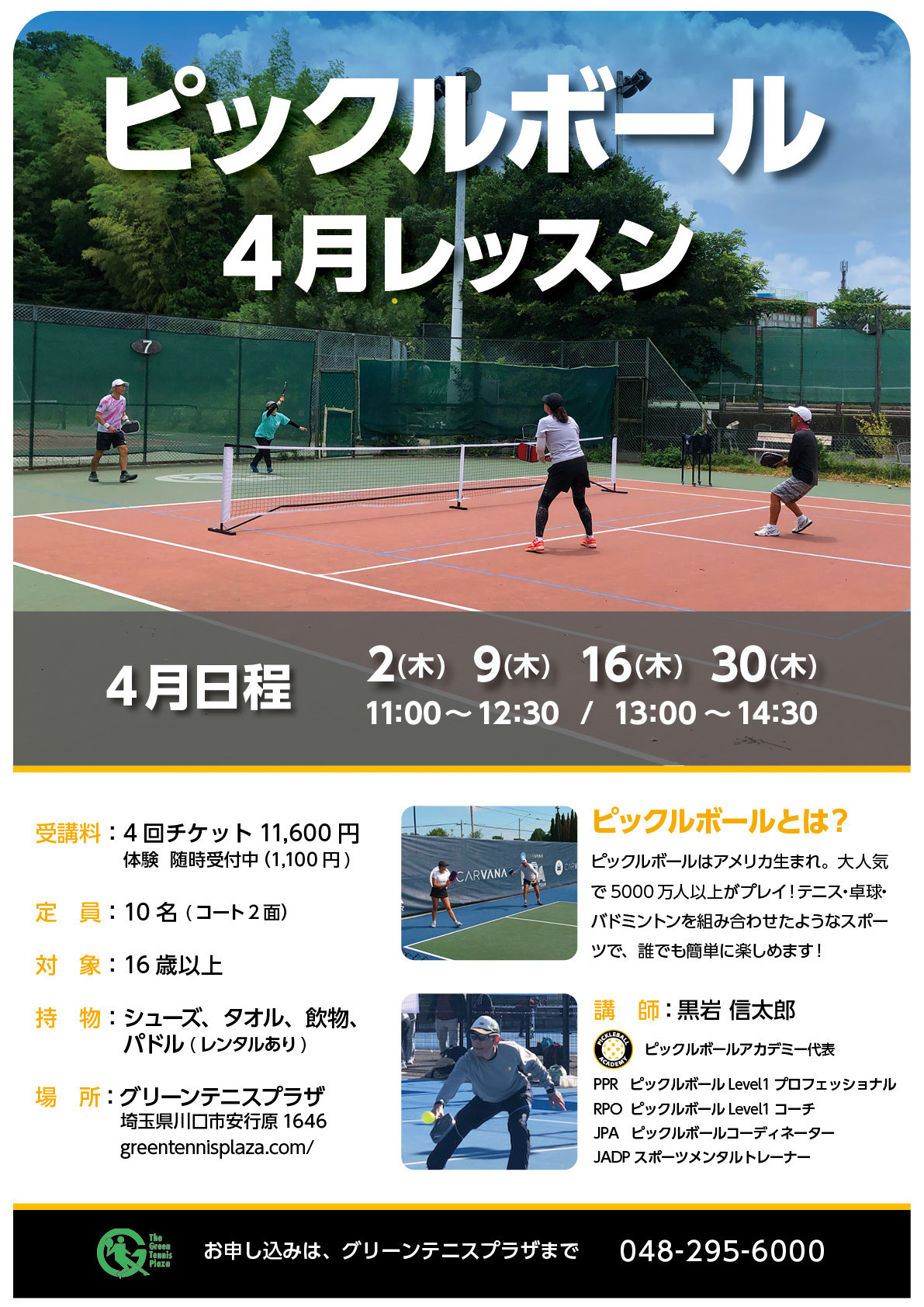 川口市のグリーンテニスプラザにて、木曜日にピックルボールレッスンを開講しています。